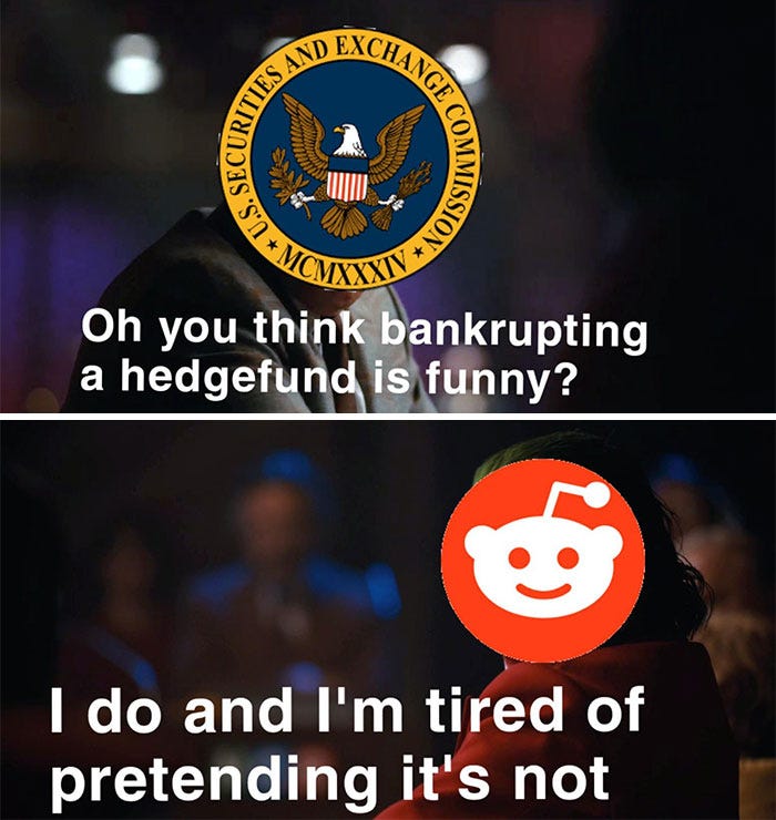 La segunda ironía está en el término mismo con el que los integrantes del foro Wall Street Bets definieron su accionar: ¨Compra Irónica¨. ¨No lo hacemos por el dinero, lo hacemos para enviar el mensaje¨, dicen, utilizando una cita de El Guasón en El Caballero Oscuro.